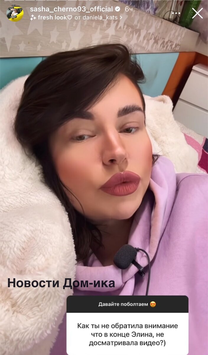 Саша Черно пыталась оправдаться как могла. Она объясняла своей подруге, что не обратила внимание на концовку видеозаписи, и не увидела Элину. Саша пояснила, что лишь хотела открыть глаза Диме на Таню. Ведь по её мнению, Димка должен знать всю правду, а то будет бедным, обманутым и несчастным.