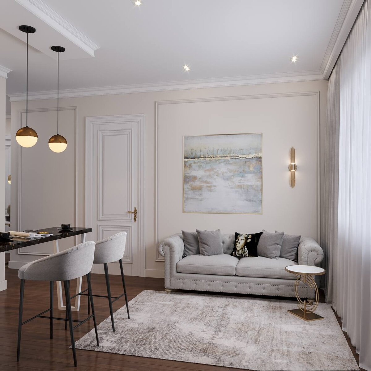 Одна из типовых ошибок в интерьере маленьких квартир - это расположить мебель вдоль стен и оставить максимум свободного места. В этом случае помещение может и будет выглядеть просторнее, но вряд ли будет уютным. В небольших квартирах, при грамотной планировке, можно расположить все, что необходимо, и при этом пространство будет радовать вас своей эстетикой и функциональностью. Как раз с такой проблемой столкнулась молодая девушка. В квартире, где она жила, на момент нашего сотрудничества уже был сделан ремонт, но хозяйке было некомфортно жить в холодном, неуютном помещении, она попросила нас преобразовать пространство в теплое и комфортное пространство, не лишенное декоративных элементов. Так на площади в 39 кв.м появилась объединенная зона кухни и гостиной, спальня, совмещенный санузел и даже две гардеробные, в спальной комнате и входной зоне. Стилистическую направленность интерьера квартиры для молодой девушки можно описать как современную, но очень уютную. Интерьер сохраняет воздушн