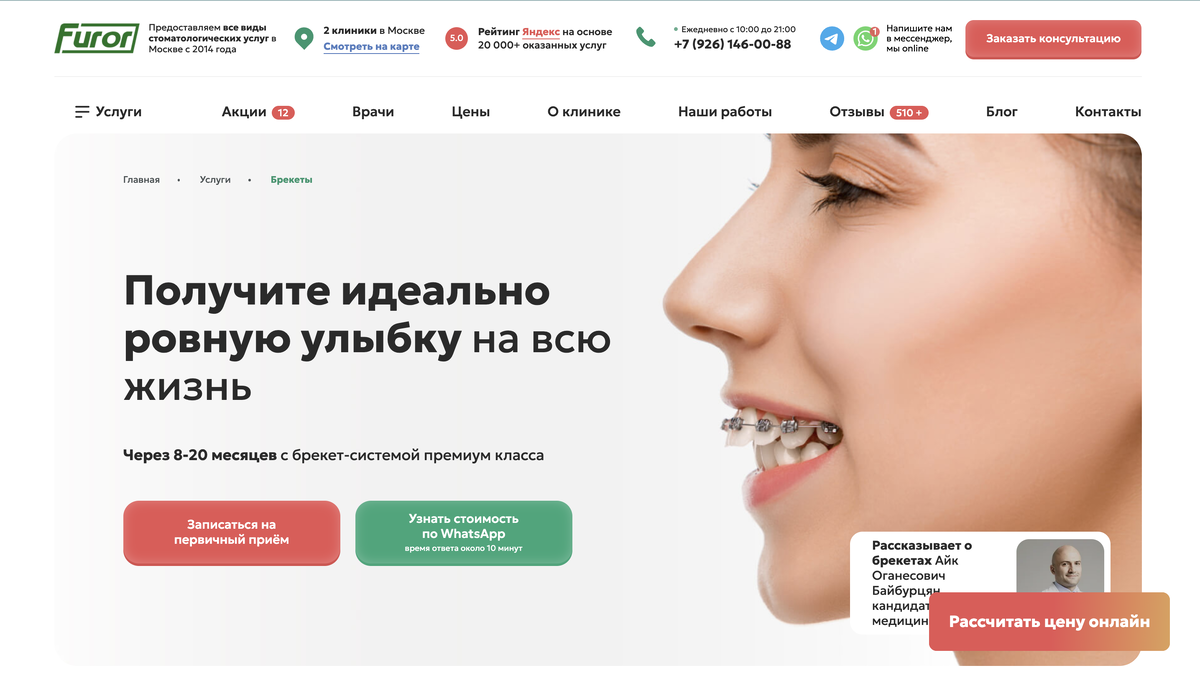 Мы понимаем боль потенциального клиента данной стоматологической клиники, мы понимаем услугу, которую он хочет получить, и мы делаем страницу, так называемую, длинную страницу, которая рассчитана конкретно под брекеты, под элайнеры, под лечение зубов во сне, под имплантацию… И так далее. Чем больше лендингов, тем лучше клиент видит ответ на свой запрос, тем быстрее оставляет заявку.