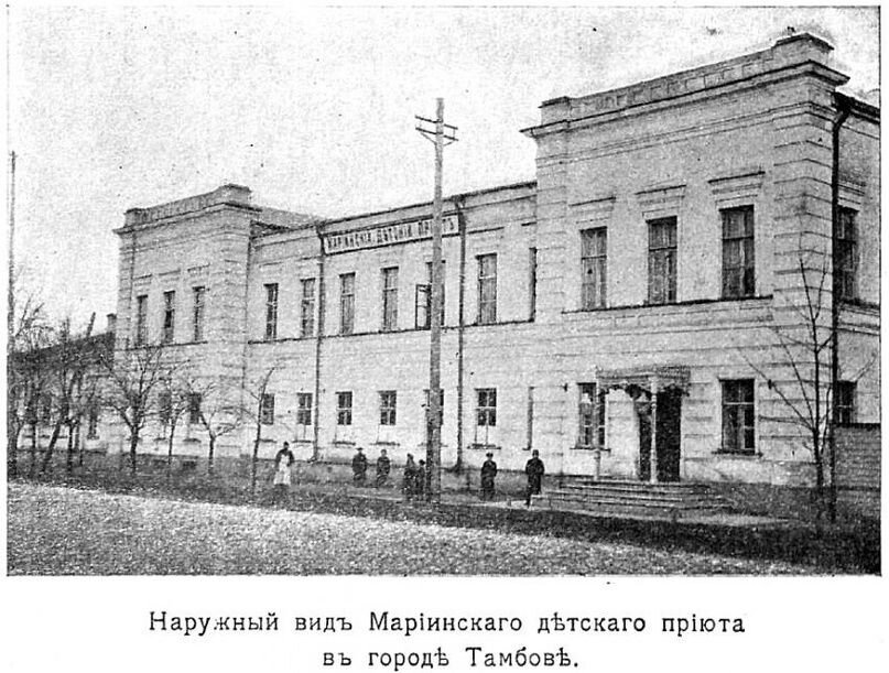 ЗДАНИЕ МАРИИНСКОГО ПРИЮТА. Активное развитие благотворительных учреждений в Тамбовской губернии началось в XIX веке. На плане города Тамбова, изданном в 1908 году в типографии Москалева, обозначено 17 подобных заведений. Среди них особое место занимали детские благотворительные учреждения. Приюты существовали преимущественно на благотворительные средства, так как государственная казна, городские и земские учреждения отпускали на их содержание незначительные суммы. В 1876 году в Тамбове был открыт Александровский приют для арестантских детей. Подобное заведение было первым в России. Для приюта Э.Д. Нарышкин приобрел и перестроил дом на Козловской улице против тюремного замка. Вместе с Нарышкиными в создании приюта принимали участие Чичерины, Хвощинские, Воронцовы-Дашковы. В 1890 на территории больничного городка было построено двухэтажное кирпичное здание, в котором разместился Елизаветинский приют для неизлечимых больных. Приют был построен на средства Л.В. Вышеславцева, в течени