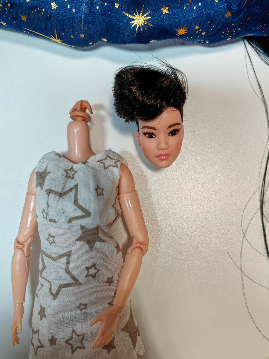Давно я не писала статей и постов, а все не просто так. Всю неделю я занималась обновлением образа Кит. Первое с чего я начала - это ознакомление с опытом перепрошивки Кит других коллег по куклохобби. Спасибо Dollect Club за подробное описание процесса, он стал моим руководством для действия. Итак, второе, что необходимо было сделать - это снять голову. От Dollect Club я уже знала, что голова Кит самая маленькая из линейки, с самым маленьким шейным отверстием. Снимала я маленькой отверткой, предварительно разогрев голову со стороны отверстия феном. Не самый простой процесс, но в итоге все получилось, голова не пострадала, шейный якорь тоже. Затем все как всегда, срезала волосы, вытащила пеньки через швейное отверстие. Флок у меня смылся водой, а коричневую прокраску с висков я оттерла жидкостью для снятия лака. Сначала хотела ее оставить, но она оказалась липкой. Так голова Кит выгладит лысой)) Далее приступила к прошивке сначала места, где уже были дырочки от заводской прошивки. Взя