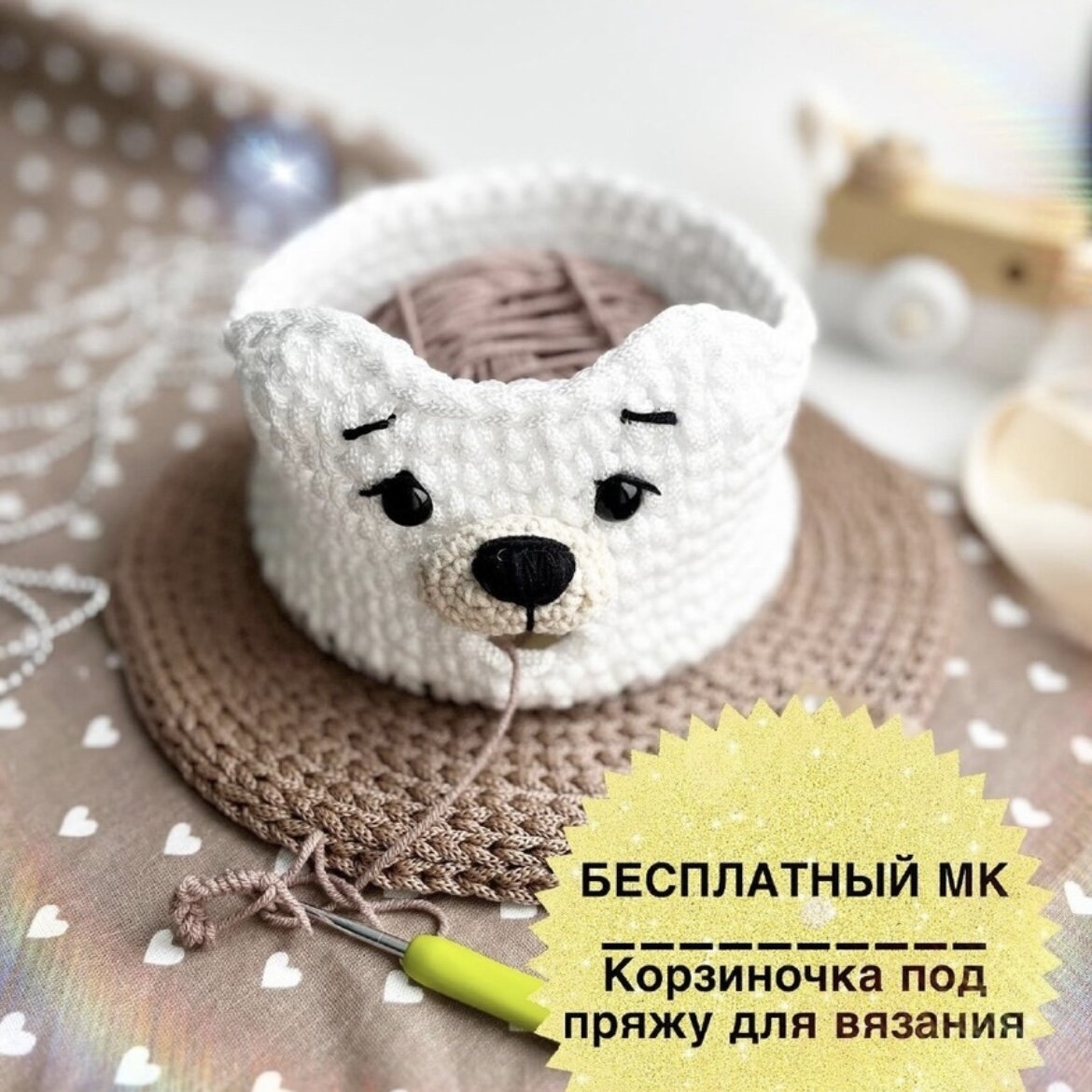 Всем доброго времени суток. Нашла полезную идею для вязальщиц и хотела поделиться с Вами. Спасибо большое автору этого бесплатного описания: Светлане Корогодовой. Вечная проблема с этими хулиганистыми моточками, которые так и норовят во время вязание убежать под стол, кровать, диван. Милая корзина в виде мишки с дырочкой для нити. Мастер класс легкий , получится даже у начинашек. Понадобиться: шнур (джут , джут+канат, трикотажная пряжа или просто плотная ника), деревянное донышко ( можно дно связать) и глазки ( но и глазки можно тоже просто вышить). Приятного времяпрепровождения Информация найдена на просторах интернета. Делитесь своими корзиночками) Ставьте лайк 👍🏻, если информация была полезна