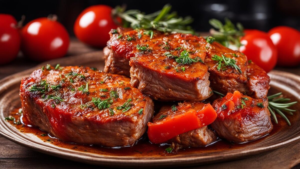 Для приготовления Мяса в томатном маринаде в духовке понадобятся следующие ингредиенты: - 1 кг мяса (можно взять свинину, говядину или курицу)