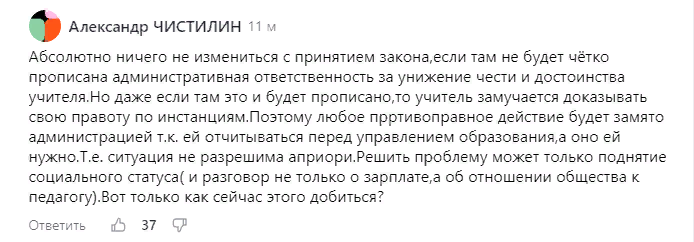 Помните, почти год назад был внесён законопроект Борисом Чернышовым о защите чести и достоинства учителя? Это было в марте прошлого года. Сколько времени уже утекло, а воз и ныне там. Закон не принят.