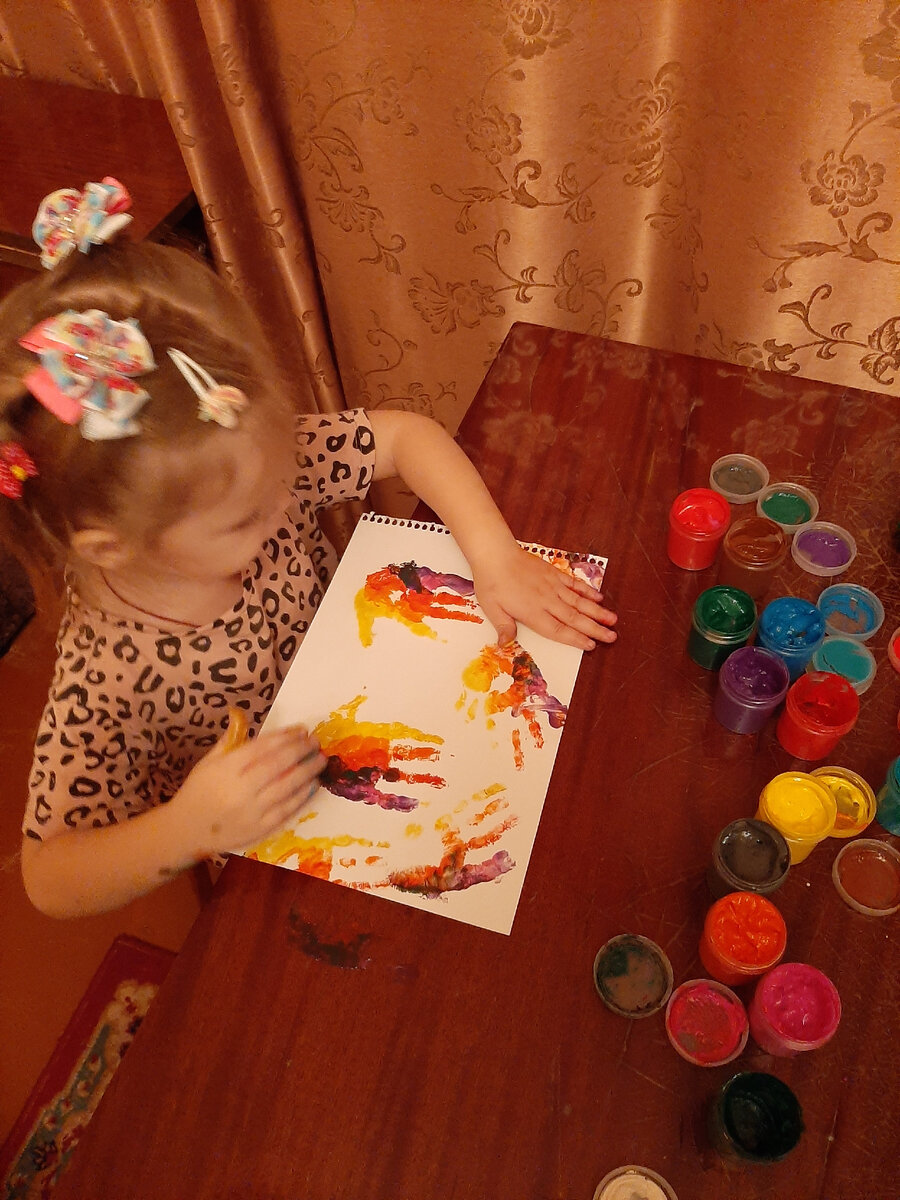 Вот и наступили праздничные выходные, а мы всё на больничном. Ко врачу только в понедельник. С утра отправимся к ЛОРу, а вечером к педиатру. В ночь со среды на четверг температурили немного, но больше думаю на перегрев, а там кто знает. Дочка, вроде, и спала в х/б пижаме, но сама кофта была с длинным рукавом, а в комнате достаточно жарко. Переодела её в футболку и дала жаропонижающее. Ни о какой прогулке, естественно, на следующий день и речи не шло. В свободное время стараемся, хоть немного, заниматься творчеством. Всё же, творческая мама (т.е. я)- это ещё иногда и "генератор" необычных идей и творческого подхода😉 А ребёнок же смотрит и многое повторяет за своими родителями😉 Новый комплект пальчиковых красок нам очень даже понравился 😍 Вчера даже в честь праздника такой вот шедевр сотворили😊🇷🇺 Вообще, считаю, что именно для развития творческой фонтазии у ребёнка достаточно обычного альбома для рисования и красок или карандашей. Раскраски же больше подходят для развит