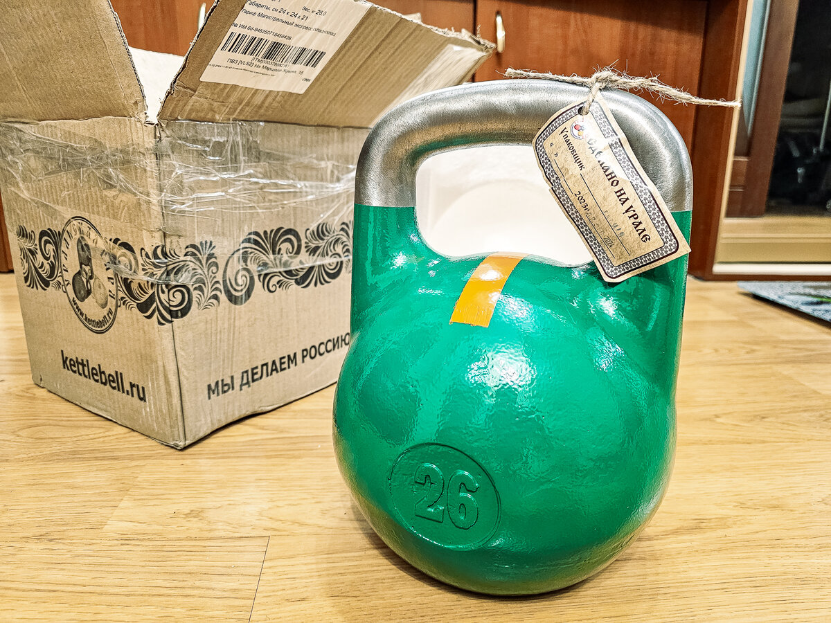 Ко Дню защитника Отечества за три дня непосредственно из первых рук - с "Верхнеуральского завода РТИ" приехала моя вторая чемпионская гиря 26 кг. Изготовлена всего за 10 дней до того, как я вскрыл и достал её из коробки. Это моя вторая гиря из той же серии. Про первую 18-ти килограммовую я в своё время снял ролик. С тех пор я достаточно позанимался и почувствовал, что она стала уже немного лёгкой. Пришло время перейти на новый уровень. Чемпионские соревновательные гири являются своего рода стандартом качества. Потому очередь на них перегружает производителя настолько, что заказы принимаются со сроком изготовления 4-5 недель практически всегда. В Москве купить такую можно, но крайне затруднительно выбрать подходящую, да ещё и поймать наличие - настолько спрос превышает предложение. Более того - продукцию стали подделывать, а это о многом говорит. Не буду пересказывать общедоступную информацию. Из особенностей знать нужно главное - у гири центр тяжести смещён к ручке, что позволяет конт