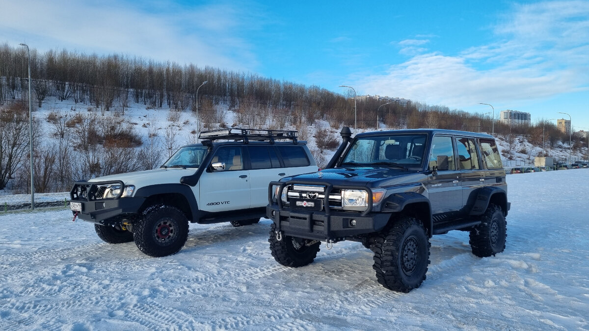 Рынок диктует свои правила. Кроссоверы с вариаторами и муфтами пришли на смену настоящим рамным внедорожникам с "понижайками" и блокировками. Для города, возможно это идеальный вариант "полноприводной" машины. А если вы любите отдыхать или путешествовать там, где нет дорог, или почти нет, то выбор не очень-то и большой. В конце прошлого года мы вам показали подготовленный NISSAN Safari. И вот теперь, из застенков компании TRUCK GARAGE выехал еще один настоящий легендарный "проходимец" - TOYOTA Land Cruiser 76. Обе машины абсолютно новые, без пробега, и подготовлены по хорошо известной, можно сказать, шаблонной схеме в которую входит: замена колес, подвески, установка силовых бамперов. шноркеля, багажника, оптики, лебедки и т.д. Особенность этой TOYOTA в том, что на ней установлены колесные редуктора, что делает машину еще более проходимой. Несколько лет назад я уже показывал подобный проект от компании Ex-road. Машина оказалась очень проходимой. Но всему есть предел и нам удалось