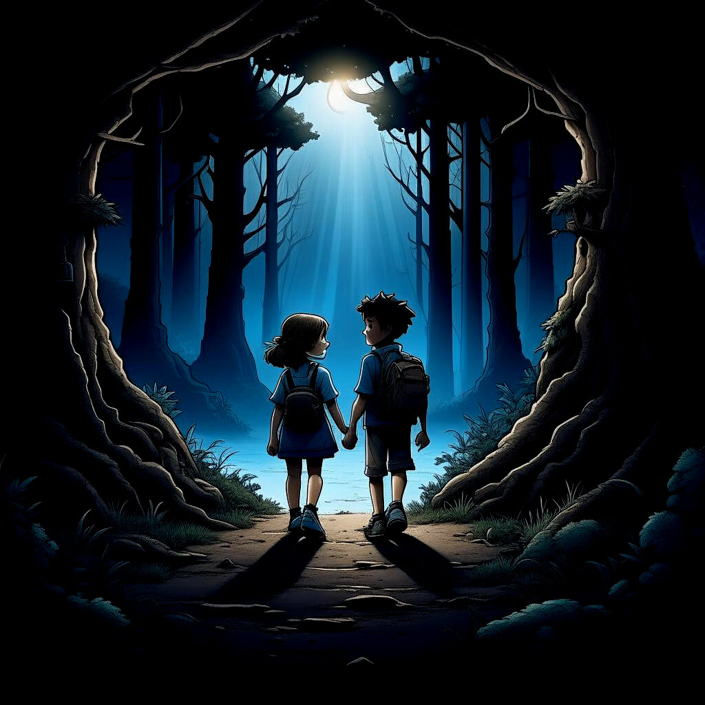 Измученные, они устроились на ночлег у старой коряги, которую не преминули разжечь, чтобы не оказаться в полной темноте. Отужинав припасами, взятыми из дома, под треск поленьев, поглубже зарывшись в одежды, маленькие, но стойкие герои уснули беспокойным сном.