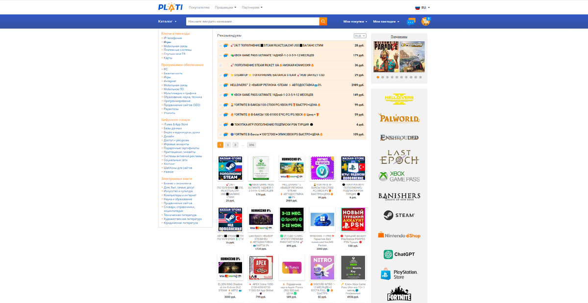 Здравствуйте, друзья! Сегодня я расскажу вам, как я пополняю баланс своей учетной записи для покупок игр через Nintendo eShop. 1. Заходим на сайт https://plati.market. 2. Видим в списке слева "Ключи и пин-коды". 3. Выбираем "Игры" 4. Ищем "Nintendo eShop" 5. На открывшейся странице будут представлены "Карта оплаты eShop". Можно выбрать фильтр сортировки и выставить нужное нам значение