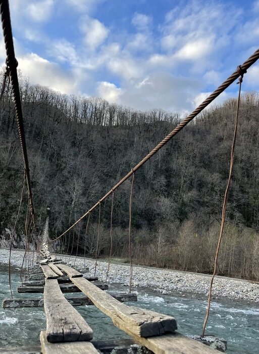 В этой статье я хочу рассказать вам о страшном, но интересном месте в Сочи. В городе Сочи есть мост. Чтобы перейти его всем надо много мужества. Мост этот назван танцующим и его название правдиво. Мост протянут над бурлящей горной рекой Шахе. Это одна из самых больших рек Сочи. Сам мост состоит из двух тросов натянутых от одного берега к другому. К тросам крепятся верёвки на которых висят доски. Начало моста уже провалилось, но там поставлена лестница. По ней можно взобраться на мост. Издалека мост выглядит как тонкая верёвка (см. фото выше.) Высота Танцующего моста над рекой невысока — 4-5 метров, но мост страшен другим. Он очень узкий и раскачивается из стороны в сторону (ещё он немного гнилой и под ним бурлящая горная рекано это уже детали).Поэтому он Танцующий. Вовсе не потому что на нём танцуют. Хорошая новость! Второй переход по мосту уже не так страшен. Проверено автором! Если вы хотите добраться до моста, то это надо сделать так. Доехать на машине вначале до села Солохаул, а п