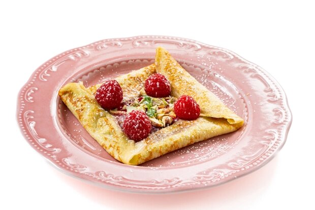 Малина по вкусу ИНСТРУКЦИЯ ПРИГОТОВЛЕНИЯ 1.Подготовить все ингредиенты. Подогреть молоко до 40 градусов. 2.Венчиком перемешать 3 яйца с сахаром (30 г) и солью до растворения сахара. 3.Влить 100 мл чуть теплого молока и перемешать. 4.Просеять всю муку, добавить соду и тщательно перемешать венчиком до однородного, густого, тягучего теста. 5.В несколько приемов вмешать в тесто оставшееся теплое молоко. 6.Добавить растительное масло и снова перемешать. Оставить готовое тесто на 15–20 минут. 7.Соединить в блендере малину, 70 грамм сахара и лимонный сок. 8.Взбить малиновую смесь до однородности и проварить в течение 7–10 минут, пока она не загустеет до состояния варенья. 9.Фисташки крупно порубить. 10.Хорошо разогреть блинную сков