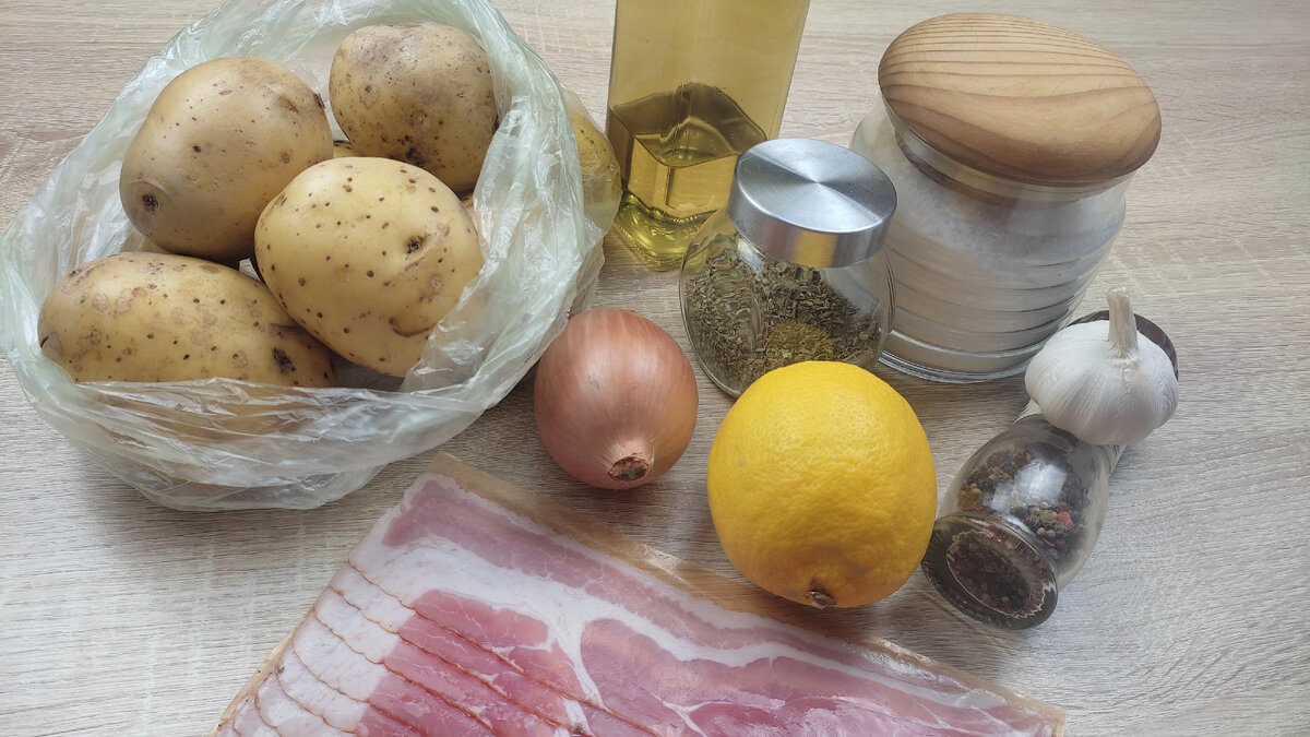 Кто не готовил картофель в беконе - потерял многое. Простое, невероятно вкусное и красивое блюдо станет украшение любого стола. Я люблю его за простоту приготовления, ведь именно поэтому его можно готовить хоть каждый день. Но также картофель в беконе можно приготовить к приходу гостей и украсить им праздничный стол. Поверьте, ваши родные и близкие по достоинству оценят это блюдо и обязательно попросят рецепт! Картофель получается нежный, ароматный и пикантный на вкус. Понравится и взрослым, и детям! Ингредиенты: Картофель среднего размера 1 кг. Бекон 250 гр. Лук 1-2 шт. Чеснок 6-7 зубчиков Масло оливковое 1 ст.л. Лимон – по желанию Смесь трав по вкусу Соль по вкусу Смесь перцев по вкусу Как же приготовить ароматный картофель в беконе? В начале я очищаю лук мою лимон. Затем лук и лимон нарезаю дольками. Маленькую головку чеснока разделяю на дольки. Выкладываю лук, чеснок и лимон на дно формы для запекания. Если вы планируете лук есть (а он получается очень вкусный)
