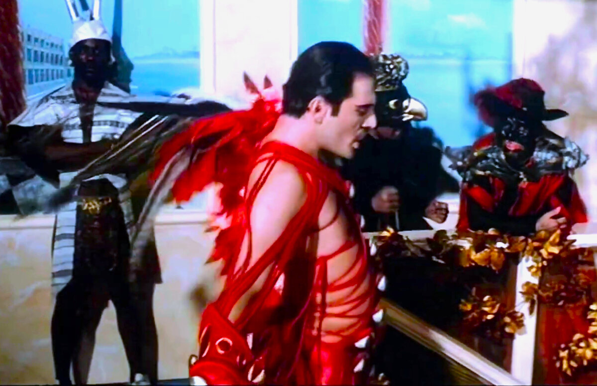 Почему глазастый костюмчик? Кто из героев легенд был со множеством глаз? А таких несколько! 😉 Наш Меркурий вполне мог объяснить сюжет клипа остальным музыкантам Queen как некую сказочку. Но для самого Фредди сказочная тема в творчестве давно осталась в прошлом...