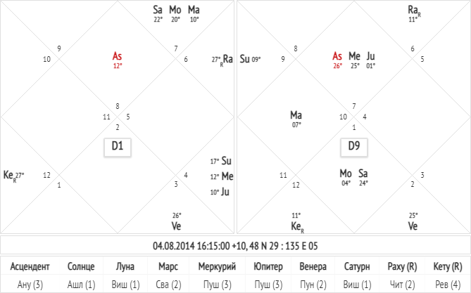 Рассмотрим карту, которая нам знакома, с точки зрения аюрведы. Аюрведа учит, что в каждом теле всегда присутствуют три энергии (доши). Их сочетание определяет индивидуальную конституцию человека. Задача состоит в том, чтобы поддерживать баланс этих энергий, сохраняя здоровье. Главным образом посредством питания. Мы то, что мы едим - основной принцип этой древней науки. Обладатель данной карты имеет Капха-Вата конституцию, то есть сочетание Вода-Воздух. Сильный Юпитер в кендре делают Капху (Воду) преобладающей. Он же формирует так называемый Юпитерианский тип. Для него характерны хорошо развитые ткани тела, мускулистость. Особенно если человек любит физическую активность, что не редкость для юпитерианцев. Кожа может иметь желтоватый или золотистый оттенок. Присутствие в конституции Ваты (Воздуха) делает скелет чуть более вытянутым, чем если бы это было только юпитерианское телосложение. Вата снижает объём, убирает излишнюю округлость и массивность. Мускулистость, о которой я упоминала