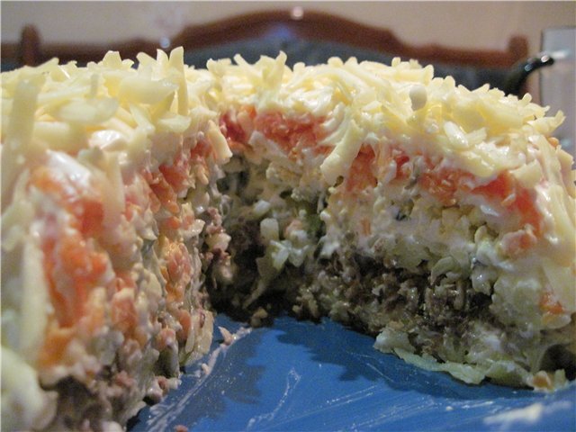 Салат с шпротами любят почти все. Как написано на упаковке некоторых продуктов - не рекомендовано только для людей с индивидуальной непереносимостью продуктов. Лично у нас - он пользуется особой популярностью и съедается мгновенно. Чем-то напоминает салат "Мимоза". Готовится быстро, но я решил заморочиться, чтобы салат получился эксклюзивным. Итак, поехали : Вареные овощи Яйца Шпроты Зеленый лук Ну и начинаем собирать салат : Шпроты и лук Морковь Яйцо Сыр Сыр трем на мелкой терке, сыпем сверху яичных белков следующим слоем. На сыр трем яичный желток, немного. Лук И voilà : Получился воздушный, вкусный, сочный салат. Решили не перемешивать его в миске, а есть как торт. Чтобы можно было вилочкой поковыряться в слоях. Некоторые добавляют орех и чернослив, кто-то маслины. Я сделал классический салат. Хвостики на украшение сверху не ложил. Мне красиво когда сверху просто зеленый лук. Ингредиенты : Все продукты доступны и недорогие. Дороговизна шпрот хорошего качества компенсируется сво