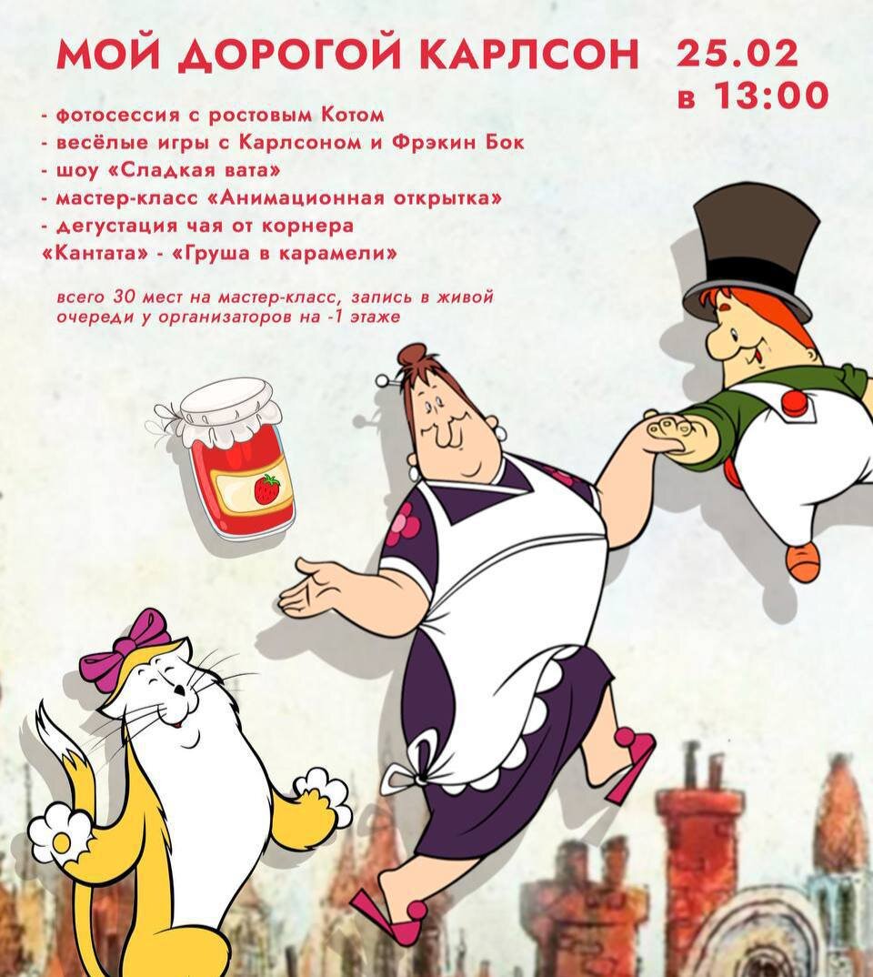 25 февраля в 13:00 на М. Трубной, Рождественский бульвар 1, Вас ждет событие, от которого дети (и, признайтесь, многие взрослые тоже) будут в восторге – детское шоу по мотивам бессмертного мультика «Малыш и Карлсон»!