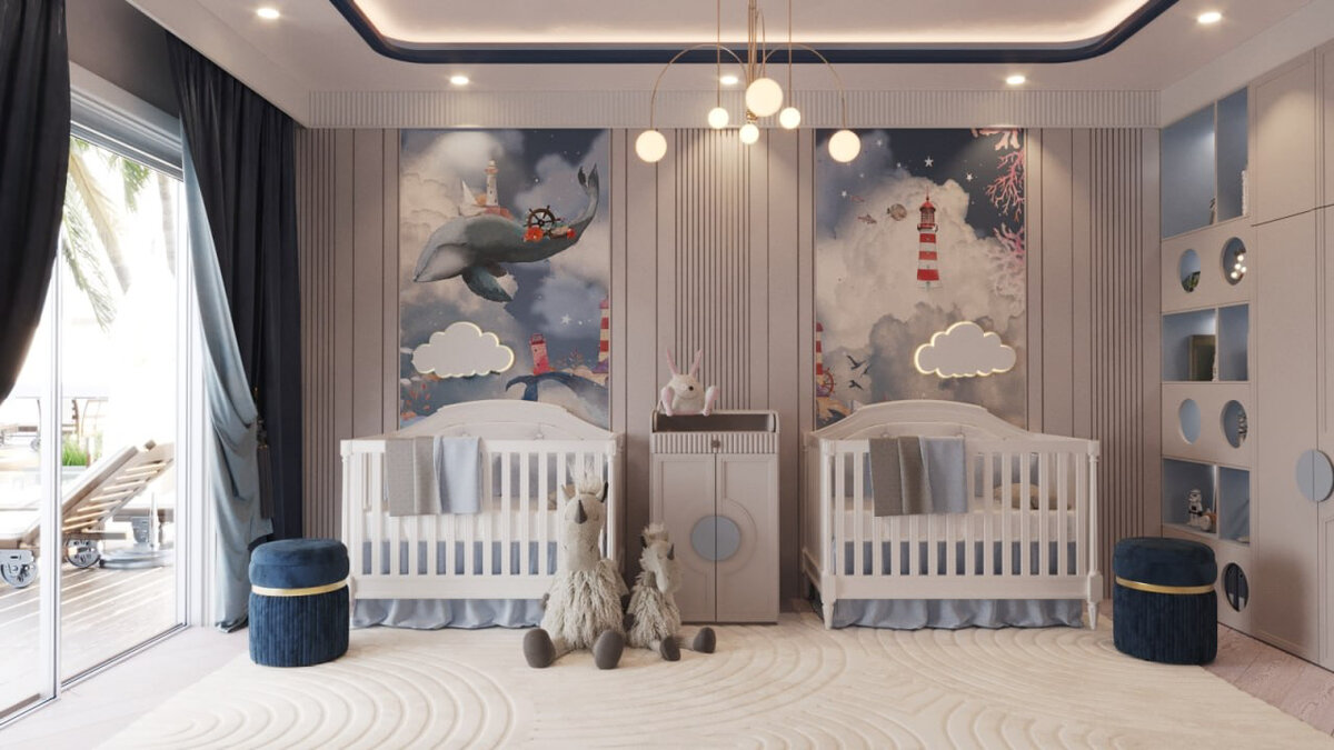 Дизайн комнаты выполнен в неоклассическом стиле и продуман так, что когда дети вырастут - с легкостью можно будет заменить кровати, оставаясь в прежнем дизайнерском решении.