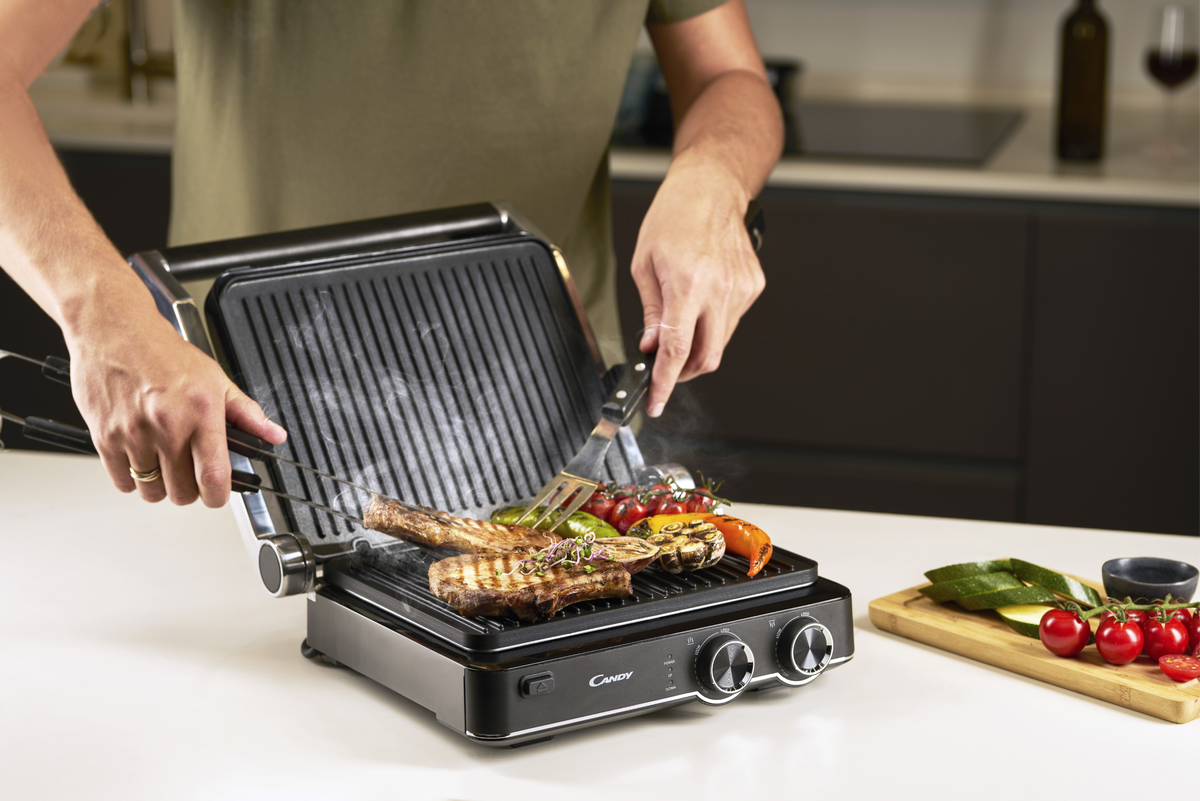 Гриль Candy раскрывается на 180° и позволяет готовить два блюда одновременно, используя при этом различные температурные настройки.