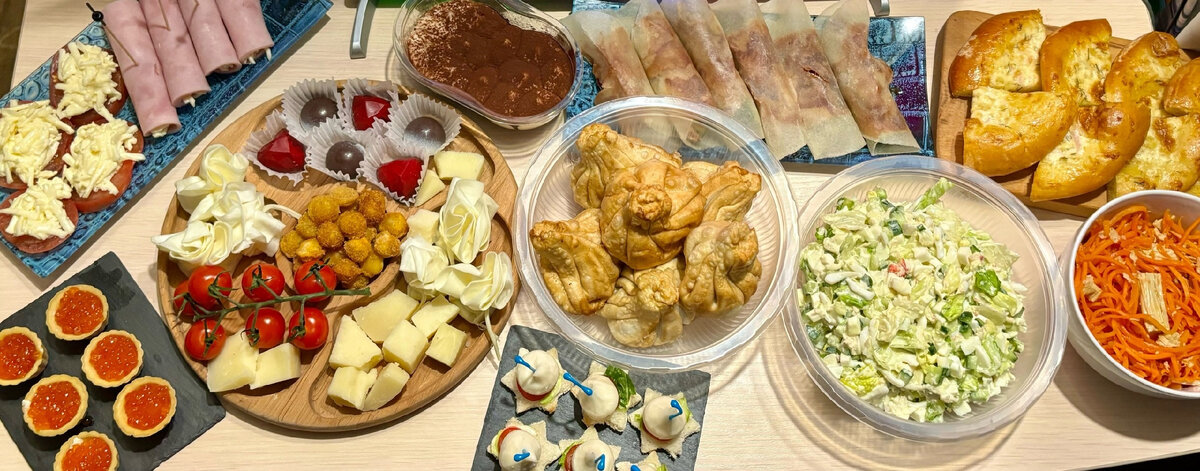 Вчера было 23 февраля и я решила сделать для мужа праздничный стол.Времени у меня особо не было,так как нужно было успеть все сделать,пока он ездил по делам,ну и мной было решено комбинировать приготовленные мной блюда с уже готовыми,купленными в магазине,смотрите что из этого получилось. 30 минут у меня ушло на весь стол полностью с учетом подготовки.Нужно было отварить яйца,приготовить то что я готовила сама,выложить и разогреть уже готовые блюда. И так,давайте рассмотрим по очереди что же присутствовало на таком столе,а так-же напишу рецепты приготовленных мной блюд. Салат с крабом и кальмаром. Для приготовления я взяла баночку краба и уже готового кальмара в заливке. Удобно что их не нужно готовить,они уже порезаны,достаточно только слить сок и можно сразу отправлять в салатник. Далее к салату добавила порезанный кубиком свежий огурец. Листья салата айсберг и романо,рву руками,не очень крупно. Кубиком нарезаю отваренные куриные яйца. Остается только заправить майонезом и можно по