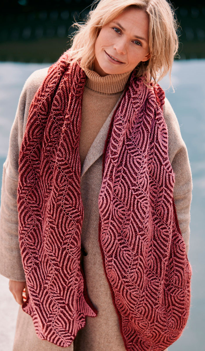 Стола с узором бриошь Размер: 35 (ширина) х 178 (длина) см. Вам потребуется: пряжа 1: Ecopuno от Lana Grossa (72% хлопка, 17% овечьей шерсти, 11% шерсти альпака; 215 м / 50 г) - 150 г бордовой; пряжа 2: Ecopuno Dégradé от Lana Grossa (70% хлопка, 19% овечьей шерсти, 11% шерсти альпака; 380 м / 100 г) - 200 г вересково-розовой; круговые спицы № 4 длиной 60 см. Патентные края (на 3 п.): 1-й р. (= лиц. р.): в начале ряда: 1 лиц. скрещенная, 1 п. снять, как при изн. вязании (нить протянуть перед работой), 1 лиц. В конце ряда: 1 лиц., 1 п. снять, как при изн. вязании (нить протянуть перед работой), 1 лиц. скрещенная. 2-й р. (= изн. р.): в начале ряда: 1 п. снять, как при изн. вязании (нить протянуть перед работой), 1 лиц., 1 п. снять, как при изн. вязании (нить протянуть перед работой). В конце ряда: 1 п. снять, как при изн. вязании (нить протянуть перед работой), 1 лиц., 1 п. снять, как при изн. вязании (нить протянуть перед работой). В высоту повторять 1-й и 2-й р. Двухцветный патентн