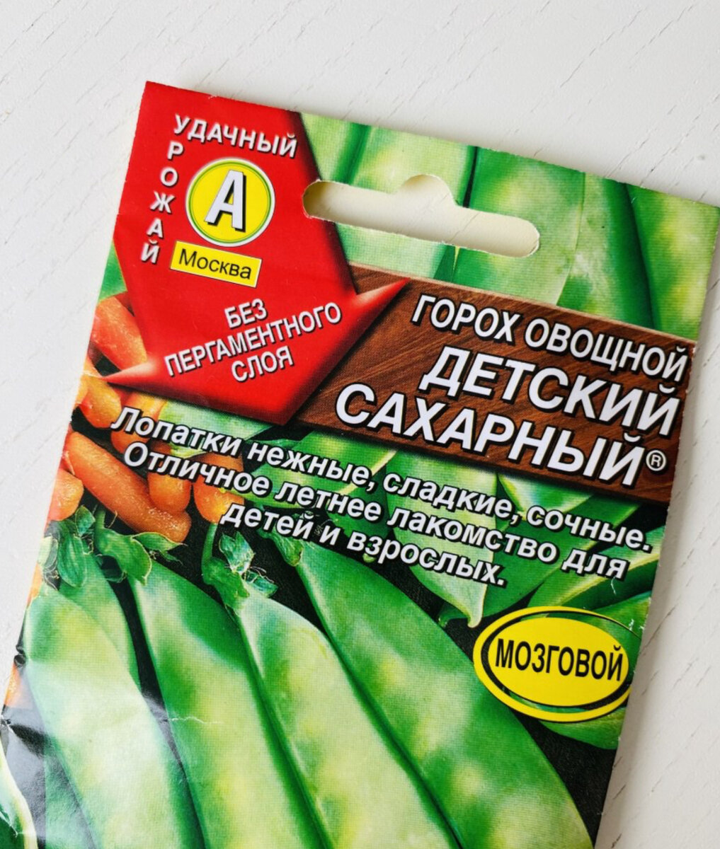 Что он представляет из себя? Среднеранний, высокоурожайный, сахарный сорт. От всходов до первого сбора 55-65 дней. Растения высотой 50-70 см. Бобы длинные, широкие. Створки не имеют жесткого пергаментного слоя. В пищу используются не только семена, но и молодые лопатки целиком. Как в свежем виде, так и после легкой кулинарной обработки вкусовые качества отличные. В биологической спелости — семена мозговые, морщинистые. Урожайность бобов в технической спелости 1,8-2 кг/м2. Вот так выглядит пакетик с семенами гороха. Стандартное о