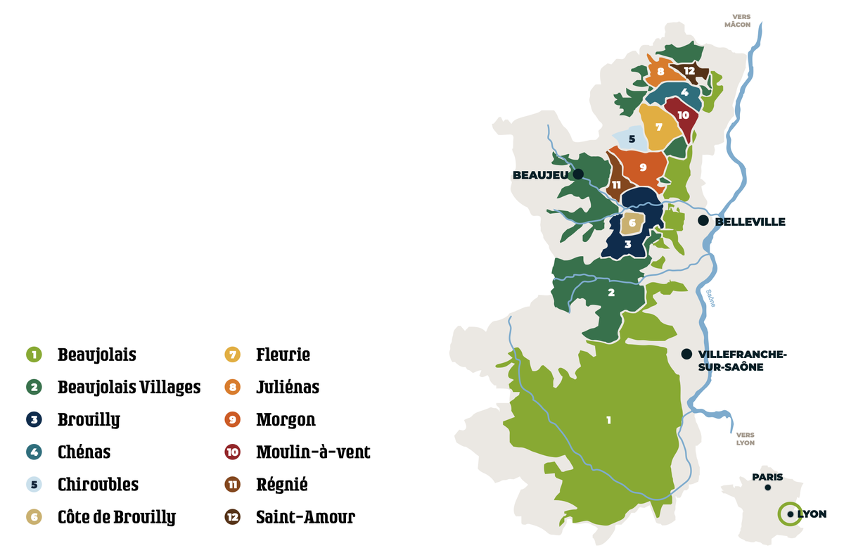 Но в Божоле, кроме Нуво, делают и обычные вина, без “жвачки” в аромате и вкусе. Делают их в рамках 12 апелласьонов, 10 из которых (крю) представляют особый интерес. На винах из этих зон вы не найдете названия сорта и слова Божоле. Исторически так сложилось, что Гамэ здесь царь, а имена зон говорят сами за себя.