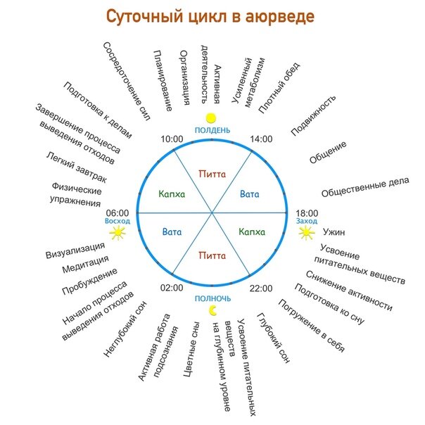 И еще немного о режиме дня с точки зрения аюрведы – древней науке о том, как быть здоровым. Аюрведа утверждает, что синхронизация своего режима с природными ритмами позволяет решить 50 % проблем со здоровьем. Распорядок дня в аюрведе называется диначарья (с санскрита «дина» – день, «ачар» – поведение). Диначарья предписывает вести очень систематизированный и размеренный образ жизни, синхронизированный с суточными циклами. Сутки делятся на шесть периодов по четыре часа в зависимости от действия дош – жизненных сил, которые создаются в результате взаимодействия первоэлементов (эфира, земли, воды, огня и воздуха). Дисбаланс дош становится причиной болезней на уровне тела и психики.