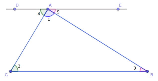 Теорема: Сумма углов треугольника равна 180°. Доказательство: Рассмотрим произвольный треугольник ABC. Через вершину A проведем прямую DE, параллельную стороне CB. Углы 2 и 4 — накрест лежащие (при пересечении секущей AC параллельных прямых DE и CB). Далее, углы 3 и 5 также являются накрест лежащими при рассмотрении тех же прямых и секущей AB. Тогда ∠2 = ∠4 и ∠3 = ∠5. Поскольку угол DAE является развёрнутым, то имеет место следующее равенство: ∠4 + ∠1 + ∠5 = 180° (1). Учитывая, что накрест лежащие углы равны, равенство (1) можно записать в виде ∠2 + ∠1 + ∠3 = 180°. То есть сумма градусных мер любого треугольника равна 180°.DE, параллельную стороне CB. Углы 2 и 4 накрест лежащие (при пересечении секущей AC параллельных прямых DE и CB). Далее, углы 3 и 5 также являются накрест лежащими, при рассмотрении тех же прямых и секущей AB. Тогда ∠2=∠4 и ∠3=∠5. Поскольку угол DAE является развёрнутым, то имеет место следующее равенство: ∠4+∠1+∠5=180° (1). Учитывая, что накрест лежащие углы равны р