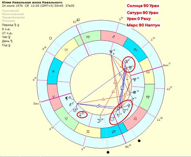 Итак, у Юлии Навальной в карте Сатурн в квадрате к Урану – борьба за свержение власти. Сатурн слабый во Льве, но он в соединении с Солнцем. Когда Солнце в соединении с Сатурном, то это один из указателей либо на болезнь, либо на потерю отца или же потерю мужа, а также ограничения в жизни, которые человек испытывает в течение жизни.