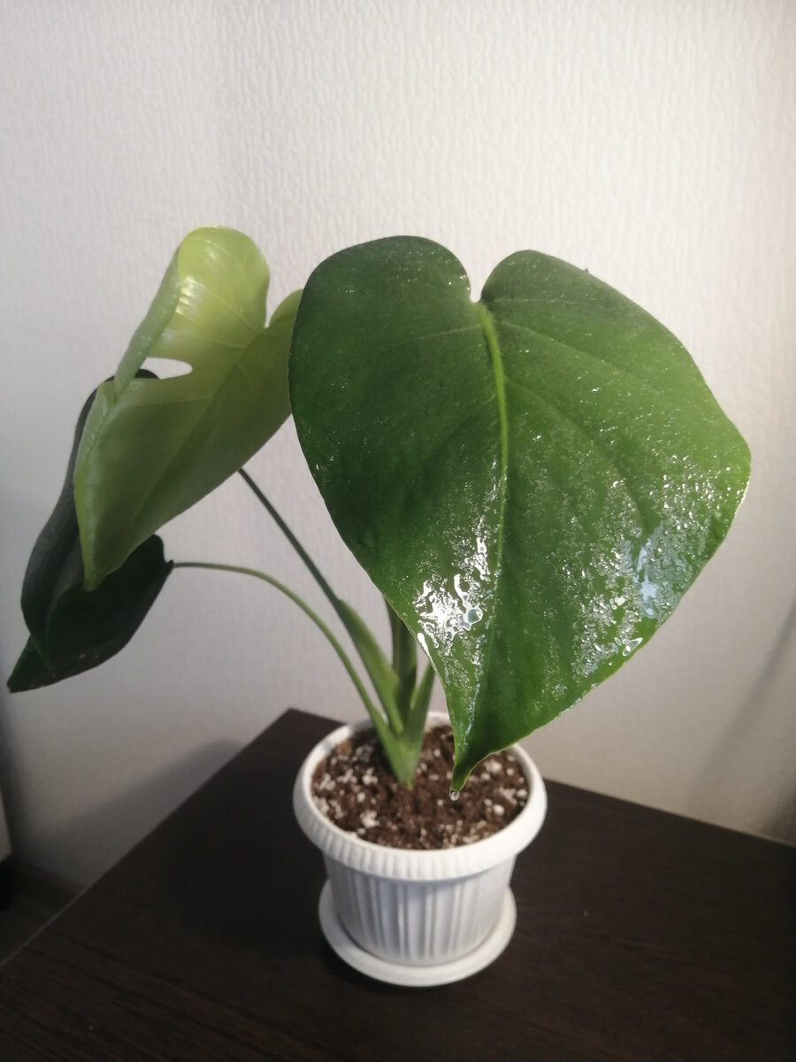 Монстера как тропическое растение нуждается в большом количестве воды,поэтому почва в горшке должна быть постоянно влажной. Чтобы не переливать вьющиеся растения, перед поливом рекомендуется дождаться высыхания верха субстрата. Лучше всего поливать через блюдце, поставленное под горшок. Средняя рекомендация - поливать растение 3 см воды один раз в неделю. Также монстере нравится влажный воздух вокруг, о чем можно позаботиться с помощью увлажнителя воздуха или поддона с галькой, смоченной водой. Также рекомендуется регулярно опрыскивать листья струей воды, желательно дождевой.