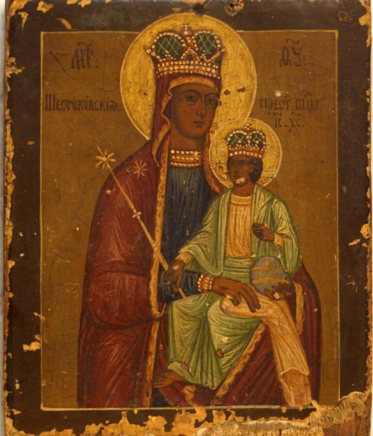 Эта икона была явлена в Москве, в середине XVIII века. Служанка Николая Димитриевича Скрипицына, которую некоторые считали блаженной, увидела во сне, что в печной трубе находится икона Богородицы. Никто не обратил внимание на её слова - все посчитали это бредом. Но на следующий день на шесток печи упал сверток. Когда его развернули, то увидели очень большой (2 метра на 1,5) образ Пречистой. На Её правой руке был виден след от ожога. Образ назвали Шестоковским - от слова "шесток". Икона, находясь в огне, на сгорела. Хозяин дома украсил образ и передал его по наследству своим детям. Наследники не стали делить такое наследство и передали икону в храм в Тверской епархии. Молитва перед этой иконой: К кому возопию Владычице; К кому прибегну в горести моей, аще не к Тебе, Царице Небесная; Кто плачь мой и воздыхание мое приймет, аще не Ты, Пренепорочная, Надеждо христиан и прибежище нам грешным; Кто паче Тебе в напастех защитит; Услыши убо стенание мое, и приклони ухо Твое ко мне, Владычице М