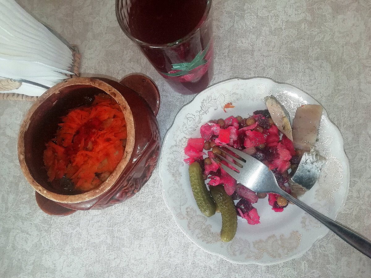 Вчера был День защитника отечества, мы собирались в обед ехать в гости к родителям поздравлять папу. Но дочка опять отличилась с утра поносом, она уже две недели на больничном, первую неделю была просто температура, а потом рвота и боль в животе, а на последок еще понос в довесок. Получается, что была все-таки ротовирусная инфекция. К обеду её немного отпустило и мы поехали к родителям. Мама приготовила на обед блюда из русской кухни – винегрет и мясо в горшочках с овощами. Я положила себе винегрета, соленых огурчиков и несколько кусочков селедки, хотя я обычно солености не ем, отекаю от них безбожно. Горшочки получились просто чудесные! Нежная и сочная свинина на подложке из капусты, лука репчатого и моркови, а на дне совсем немного картофеля. Вечером еще пили чай с меренговым рулетом без сахара. Дома потом ужинала поздно в восемь вечера, немного тушеных овощей и отварное яйцо. Дочка была весь день на сухарях, а к вечеру ей совсем полегчало и она поела рисовую кашу на воде. Мама с сес