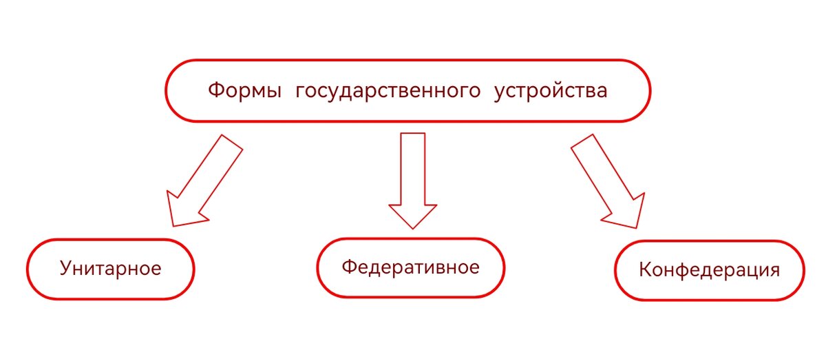 Форма государственного устройства — это то, как организована территория государства, на какие части она делится. Государство по форме государственного устройства делится на: 1) Унитарное (простое) государство – это единое государство, территория которого для удобства управления делится только на административно-территориальные единицы, не обладающие признаками государства. Все эти единицы управляются из единого центра. Существует единый гос. аппарат, законодательство, гражданство, валюта, налоги (Беларусь, Польша, Франция). 2) Федеративное государство — это сложное государство, в состав которого входят несколько государств или государственных образований, называемых субъектами федерации. В федерации существует разграничение полномочий между федеральными органами и органами власти субъектов федерации. Валюта - едина, гражданин субъекта федерации является одновременно и гражданином федерации в целом (США, Бразилия, Швейцария). 3) Конфедерация – временный союз суверенных государств, обра
