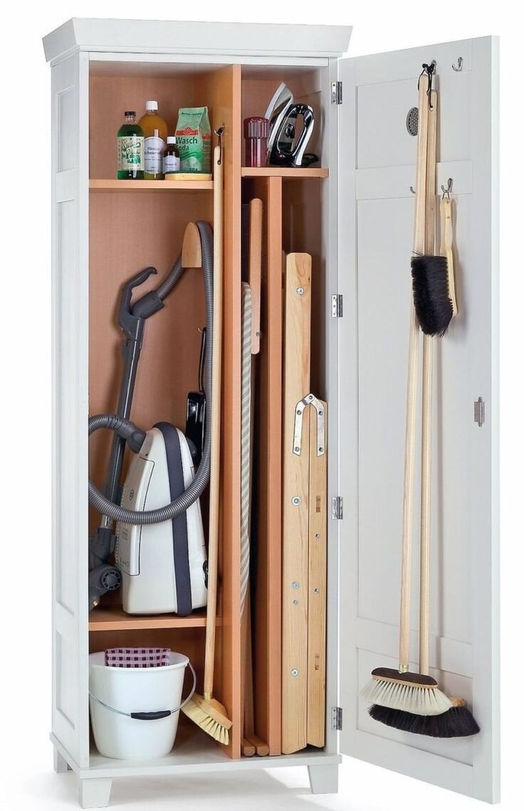 Торец шкафа, не прилегающий плотно к стене, также может использоваться для хранения уборочных принадлежностей. Можно встроить выдвижной вертикальный ящик для хранения или рейлинги с крючками.
