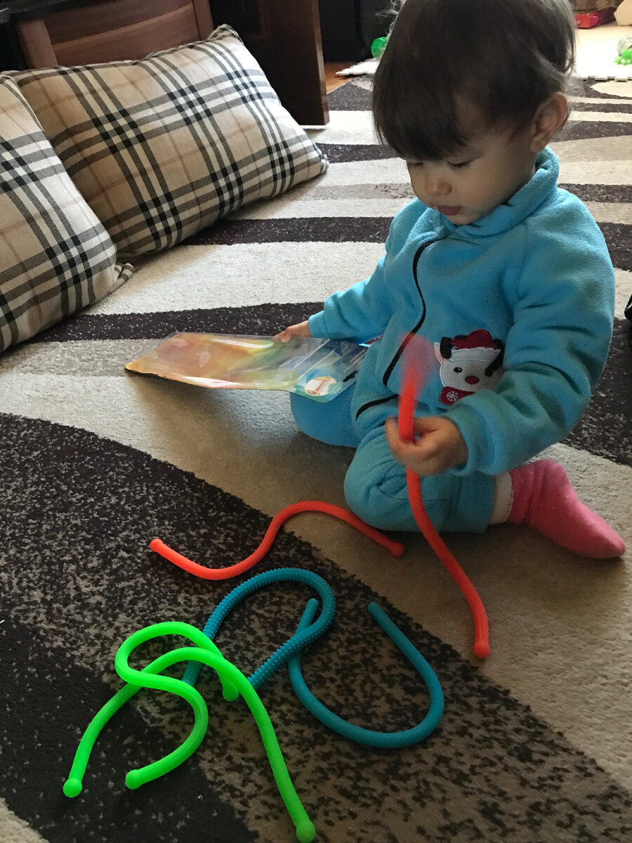 Дочка растёт (уже год и 3 месяца), становится сложнее ходить с ней по магазинам. В коляске ей скучно, хочется побегать… А я только и успеваю за ней. Если не бегает, то всячески проявляет своё недовольство (надоело, пора домой). Бабушка иной раз зовёт меня прогуляться по магазинам, я радуюсь, но по итогу очень сложно искать что-то стоящее среди сотен товаров, когда доча рядом 🤪 Сегодня мне это как-то удалось, поэтому будем считать, что шопинг выдался на славу. Теперь немного похвастаюсь покупками. Дочка не выдержала, распаковала их сразу, как домой пришли. Видела такие резинки у нашей двоюродной сестренки, с их помощью мама объясняла понятия длинный-короткий. А мы вообще любим всякие висюльки и шнурки, поэтому игрушка зашла хорошо. Функции производитель заявляет такие: Вообще написано, что 3+. Ну я даю, пока вроде не прогрызаем резинки эти. Подавиться вроде нечем, а текстура дочке нравится, с интересом щупает. Недешевое удовольствие, 199 р. 2.Книжка с липучками. Дочка обожает наклейки,