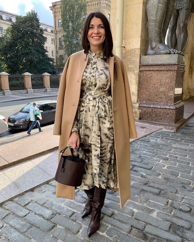 Если соединить бежевое пальто с принтованным платьем миди, высокими сапогами, то получится сдержанный и красивый наряд на весну. Детали: компактная сумка, лаконичные украшения.