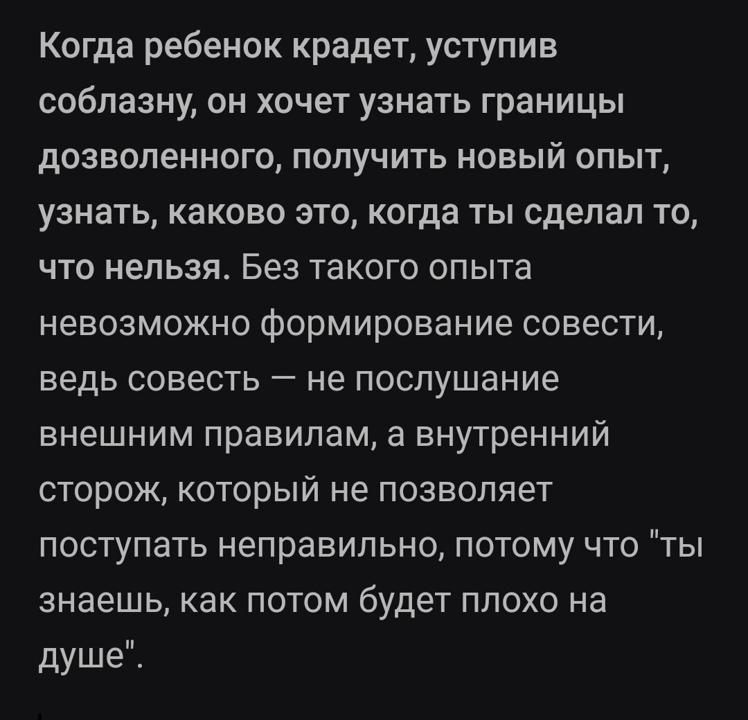По двум предыдущим историям всем, наверное, уже понятно, что мама Лиса — та еще вертихвостка. А, от осинки, как известно не родятся апельсинки. Сегодня о детском воровстве как об этапе формирования личности. Вот что на этот счет пишет любимая мною Петрановская: История 1. Три рубля в чужой куртке Мне было лет 7 или 8 лет. Шел урок чтения, но я отпросилась в туалет. Вышла из класса и пошла в направлении к туалетной комнате. Прошла по коридору прямо, завернула за угол и дошла до вешалки с верхней одеждой. Еще пара шагов и эта история закончилась бы не начавшись, но в тот день что-то пошло не так. Мой взгляд зацепил длинный пуховик. От мысли, которая кольнула сознание загорелись уши. Я оглянулась, прислушалась — в коридорах было пусто, за классными дверьми были слышны отголоски учительских голосов. Миг и моя рука уже шарит в кармане чьей-то куртки. А там... Целых три рубля! Я быстро сунула Находку в карман штанов и рысью побежала в туалет. Три заветные монетки жгли мне пальцы пока я