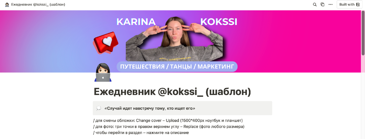 🌸 Делюсь своим шаблоном в Notion для приятного перехода из заметок и комфортного начала работы с приложением. Буду рада, если поддержите и поделитесь своим отношением к планированию в комментариях (как выстраиваете свою рутину, как часто прописываете цели стратегические цели, выписываете ли ежеднеыне to-do листы?) 📝Чтобы сохранить себе его, нажмите в правом верхнем углу Duplicate 📌 ШАБЛОН, КЛИК 🩹 Рекомендую использовать его на ноутбуке или планшете! (есть приложение для телефона и планшета, так и называется - Notion) Также в категориях под *добавила ссылки на полезные ресурсы, которые могут пригодиться, если вы только начинаете выстраивать структуру своей работы или погружаетесь в планирование. а еще мне посоветовали шаблоны для Notion, они в закрепе на моем ТГ-канале, забирайте! :) в ТГ-канале рассказываю: - что такое маркетинг и как он работает - интересные новости индустрии - как пришла в маркетинг - как проходят отборы в топовые компании - про собеседования - про резюме - как