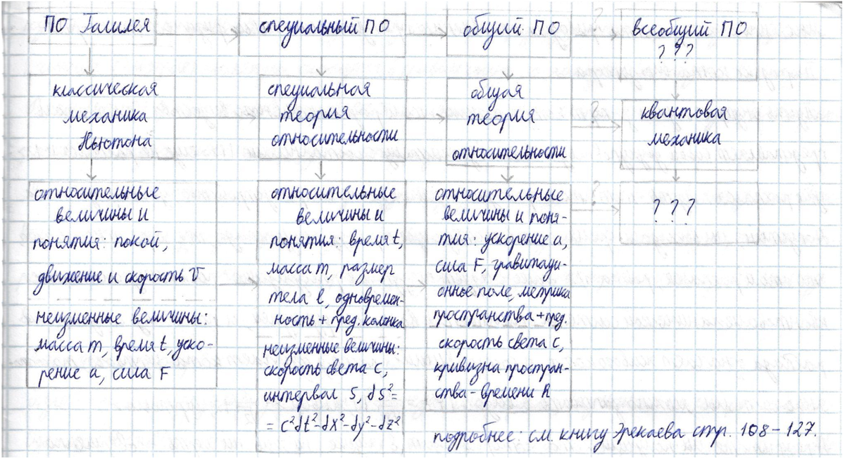 Первая формулировка принципа относительности (Галилей, 1632 г.). „Прилежно наблюдайте все это, хотя у нас не возникает сомнения в том, что пока корабль стоит неподвижно, все должно происходить именно так. Заставьте корабль теперь двигаться с любой скоростью и тогда (если только движение будет равномерным и без качки в ту и другую сторону), во всех названных явлениях вы не обнаружите ни малейшего изменения и ни по одному из них не сможете установить, движется ли корабль или стоит неподвижно. Современная формулировка (Вообще вроде Ньютон сказал): „Во всех инерциальных системах отсчёта законы механики действуют одинаково, то есть нельзя путем постановки механических экспериментов отличить одну инерциальную систему отсчёта от другой." Следующая ступень эволюционного восхождения принципа относительности связана с разработкой Лоренцем, Пуанкаре и Эйнштейном специального принципа относительности в электродинамике. Современная формулировка: все законы физики сохраняют свой вид в любых инерциа
