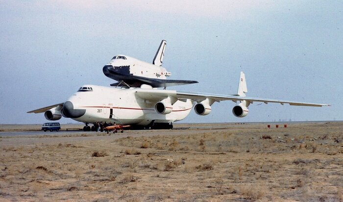 На данных снимках мы видим советский многоразовый космический корабль "Буран" и грузовой самолет Ан-225 "Мрия", который предназначался для его доставки из пункта А в пункт Б. Кроме того, на снимках показан первый совместный полёт "Мрии" и "Бурана". Вообще, сама "Мрия", как раз-таки и проектировалась для того, чтобы перевозить на себе многоразовый космический корабль "Буран". Сроки по проектированию самолета поджимали, поэтому за основу был взят другой грузовой самолет - Ан-124 "Руслан". В целом, конечно же,Мрия" похожа на "Руслан", но все же имеет свои определенные отличия. Фюзеляж Ан-225 длиннее "Руслана" и составляет 84 метра. Высота самолета - 18, 2 метра. Сильным отличием является то, что "Мрия" имеет двухкилевое хвостовое оперение, а также по одному дополнительному двигателю на каждом из крыльев, если считать, что крыльев на самолете две штуки. Также самолет имеет большее количество стоек шасси и нет хвостового грузового люка. К большому сожалению в 1994 году космическую программу