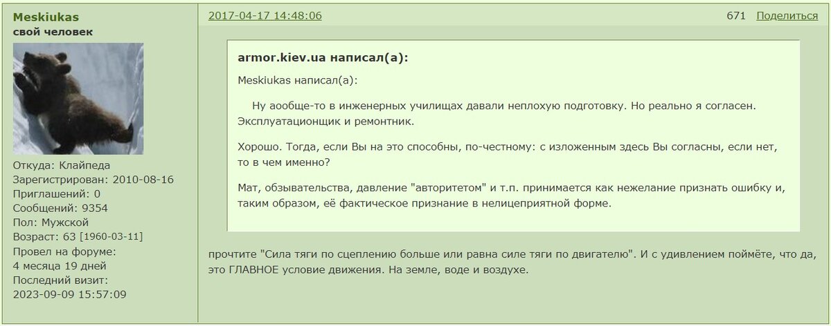 Говоря коротко. Товарищ уверен, что его утверждение «Сила тяги по сцеплению [с грунтом] больше или равна силе тяги по двигателю» — главное условие движения. А если сила сцепления с грунтом ниже силы тяги по двигателю, то движение невозможно, «идет простая пробуксовка».