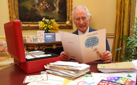 На снимке король сидит за столом в комнате XVIII века в бельгийском люксе Букингемского дворца. Он смеется над открыткой с изображением собаки. Домашнее животное носит елизаветинский ошейник – или «конус позора» – после прохождения ветеринарного лечения. Подпись гласит: «По крайней мере, Вам не обязательно носить конус!» Среди государственных бумаг Его Величества в красной коробке можно увидеть десятки открыток.
