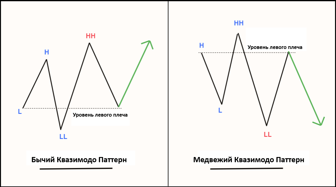 Паттерн QM — это графический паттерн, который показывает формирование более высоких максимумов, более низких минимумов и уровня левого плеча. Он также известен как паттерн Квазимодо.