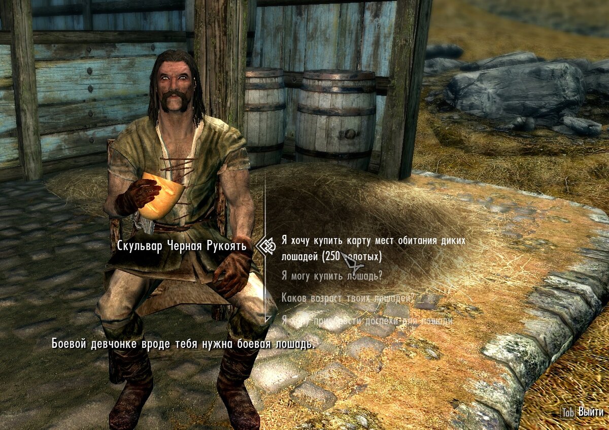 Узнать о лошадках можно за небольшую плату 250 септимов у местного конюха. Она нам продаст карту обитания диких лошадей и пояснительные записи к ней.