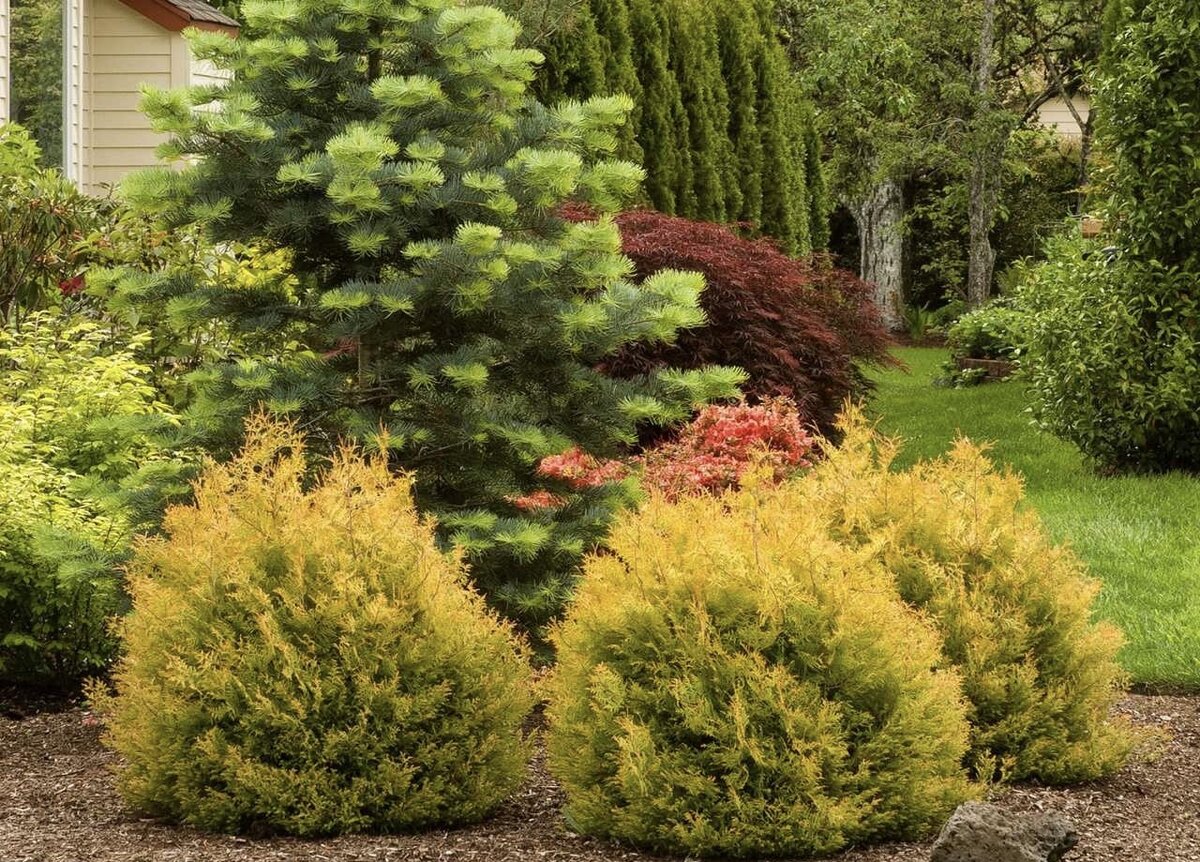 Сосны, ели, туи, можжевельники… Выбор хвойных растений жёлтого цвета достаточно велик. Они добавляют ярких красок в сад, и что особенно важно - помогают оживить однообразный зимний пейзаж наряжу с другими вечнозелеными кустарниками. Карликовые хвойные подойдут для каменистых садов и каскадных миксбордеров на передний план. Хвойные среднего размера хорошо сочетаются с пионами, хостами, рододендронами, спиреями, розами и другими декоративными растениями. А высокие отлично подходят для создания живой изгороди. Практически все хвойные растения хорошо отзываются на формирующую обрезку.