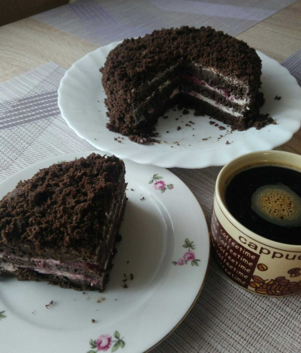 Бисквит разрезать на три коржа. Промазать кремом коржи, верх и бока торта (крема не очень то и хватило, обмазывала просто сметаной где не хватало).