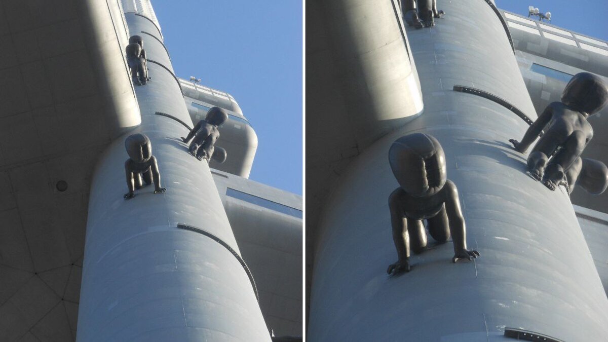 Жижковская телебашня по-чешски звучит как Žižkovský vysílač. Её невозможно не заметить. 216 метров – самое высокое сооружение в Чехии. И у неё непростая судьба. С самого начала Жижковская башня производила весьма неоднозначное впечатление. Три столба, объединённые горизонтальными площадками – то ли автомат, то ли космический корабль. Обратите внимание на чёрных младенцев, ползущих по сооружению вверх и вниз. Первоначально они не были запланированы. Появились эти чудные бронзовые создания в 2000 году благодаря скандально известному скульптору Давиду Черному. Вот такие милые личики. Место каждого – строго выверено автором. Вес одной скульптуры — 700 килограммов. Любопытный факт. Саму башню пражане неустанно ругали и продолжают ругать. Дескать, не вписывается она в общую архитектуру города. Возмущает их и то, что при строительстве пострадало расположенное рядом еврейское кладбище. А вот младенцы горожанам очень полюбились. И когда в 2001 их сняли, люди выступили единым фронтом, подписали