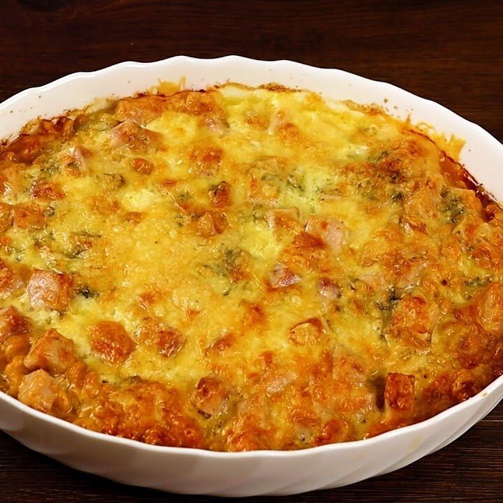 Сверху макарон раскладываем нарезанную на кубики ветчину.