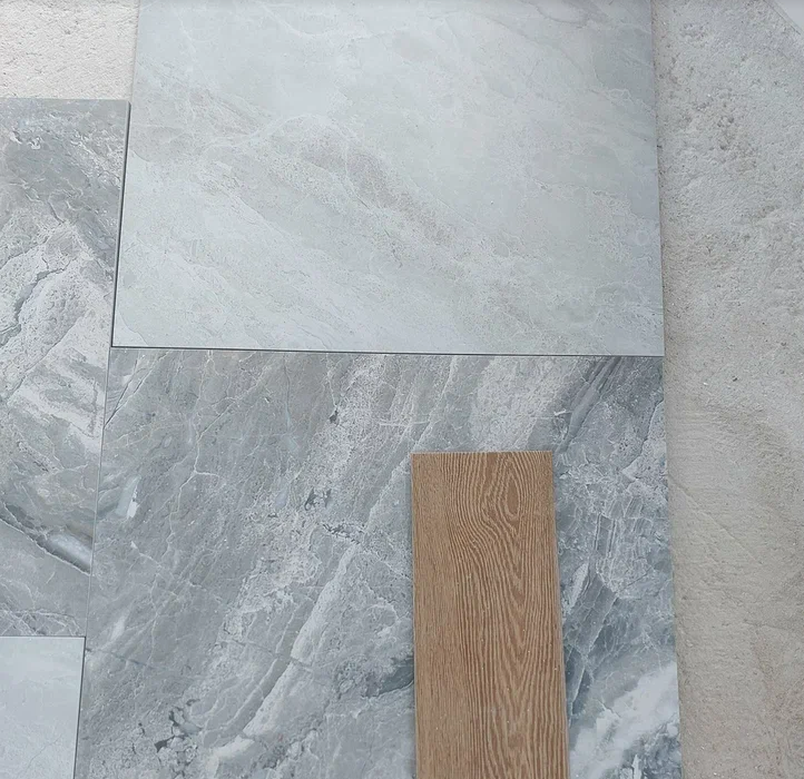 Плитку мы выбирали все вместе ещё на Новогодних каникулах, постаралась в рамках своеобразного Настиного вкуса выбрать посимпатичнее. Её естественно тянуло на плитку, которую не отличить от грязного бетона, перенаправила её взгляд на серую, но со структурой камня, а не царапин. А в один санузел выбрали так вообще красивую крупноформатную 60х120 см плитку.
