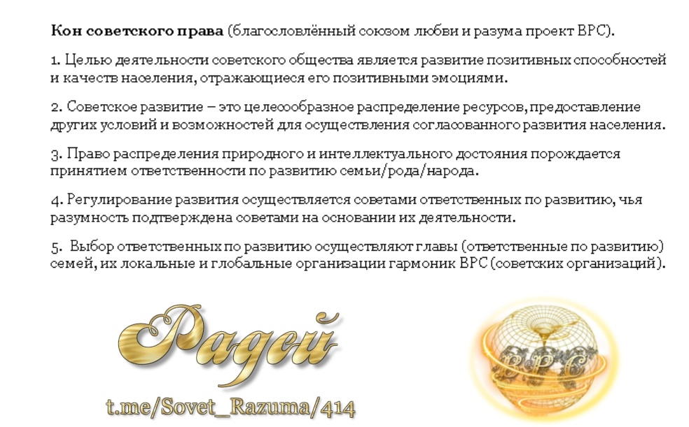 3.2. Законодательное право (вкл. распределение бюджетов) принадлежит семейным, домовым, уличным и квартальным Советам и осуществляется открытым электронным, или другим видом голосования после открытых рассмотрений специалистами по каждому вопросу.